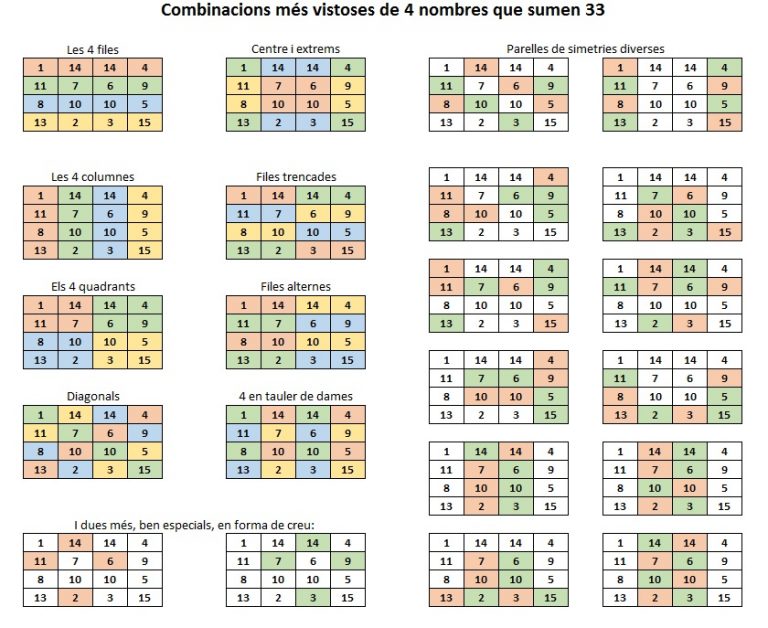 A tall d’exemple, vegeu aquí marcades, en colors diferents, tan sols algunes de les possibles combinacions de quatre nombres més vistoses que sumen 33: