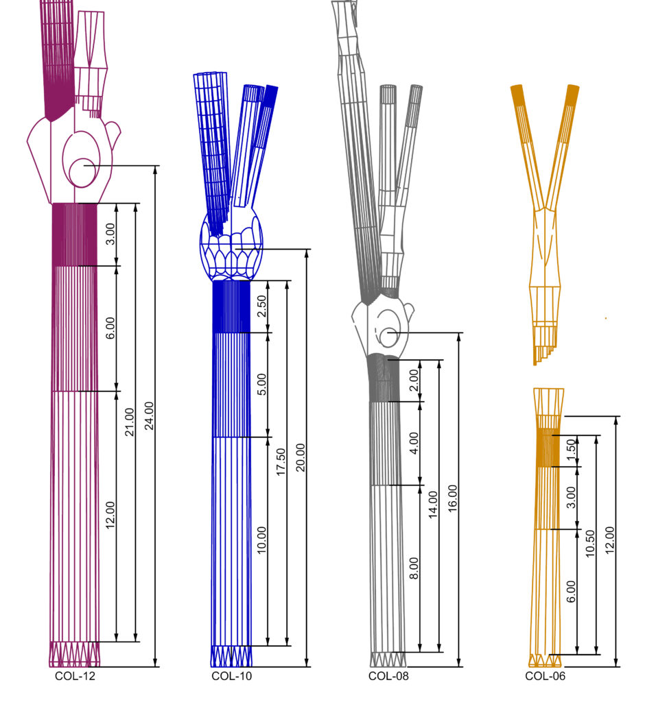 The total height of each column is always, in metres, double the number of points on the star, featuring a base, shaft and capital. The height of the bases is always the same as the number of points in decimetres, while the shaft is always the sum of the first three sections that make it up. Additionally, the inner diameter of each column and the height of the shaft follow the same relation of 1:10, meaning the height of the shaft is always ten times its inner diameter. See the table below: