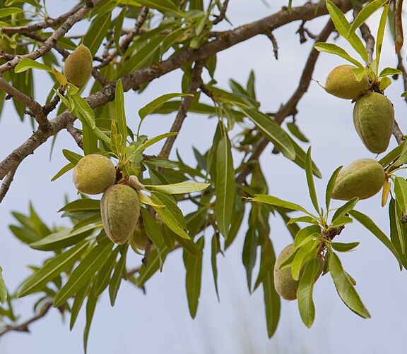 Ametller (esquerra) i panera amb ametlles a la nau lateral de la banda de la façana de la Passió de la Sagrada Família (dreta)