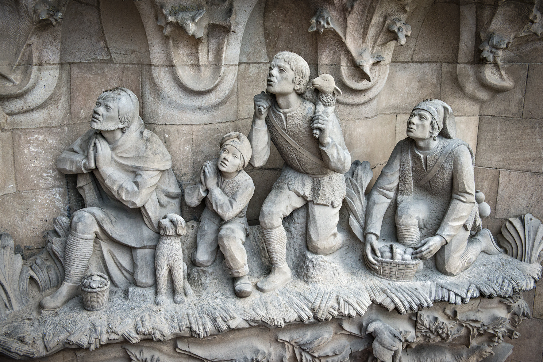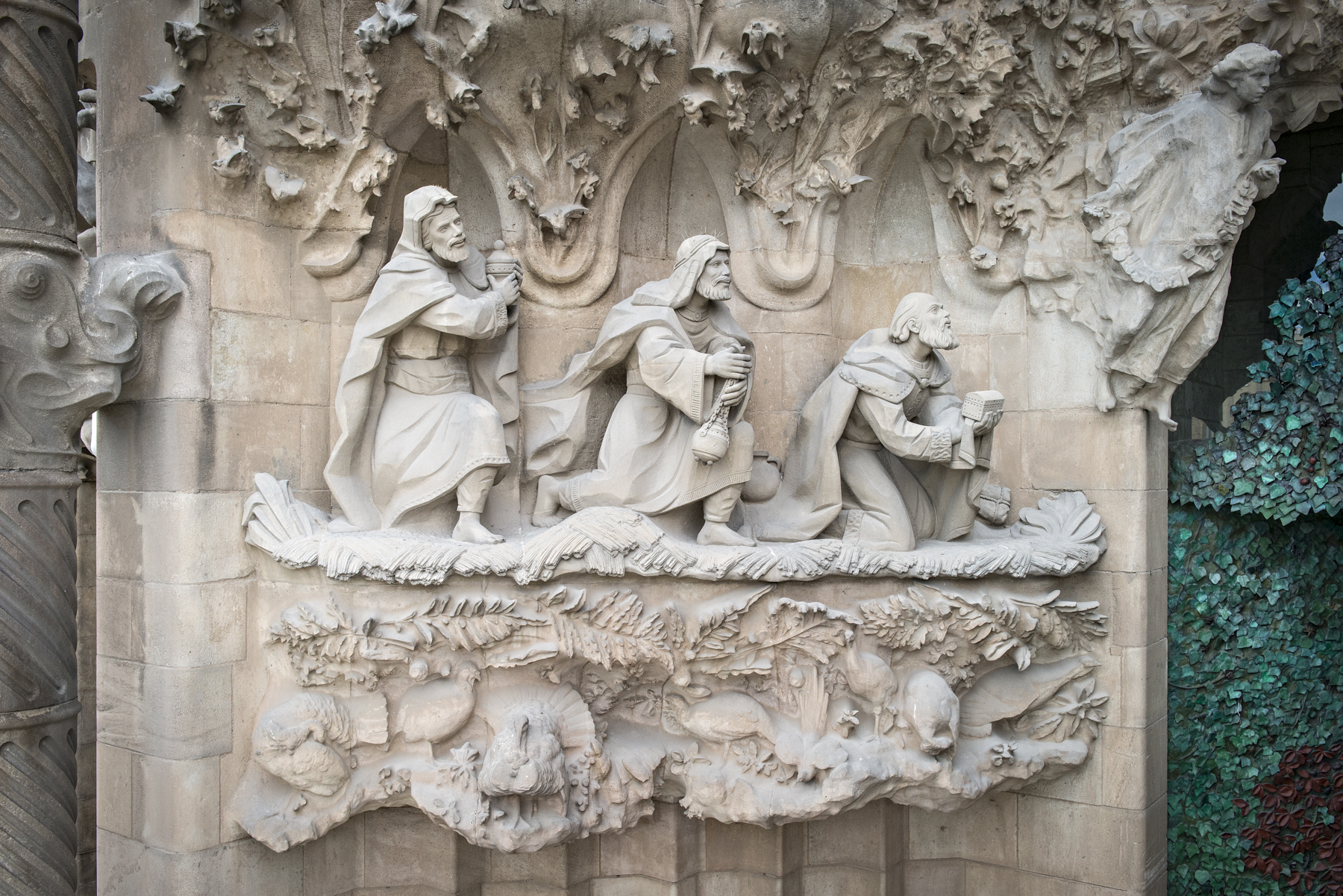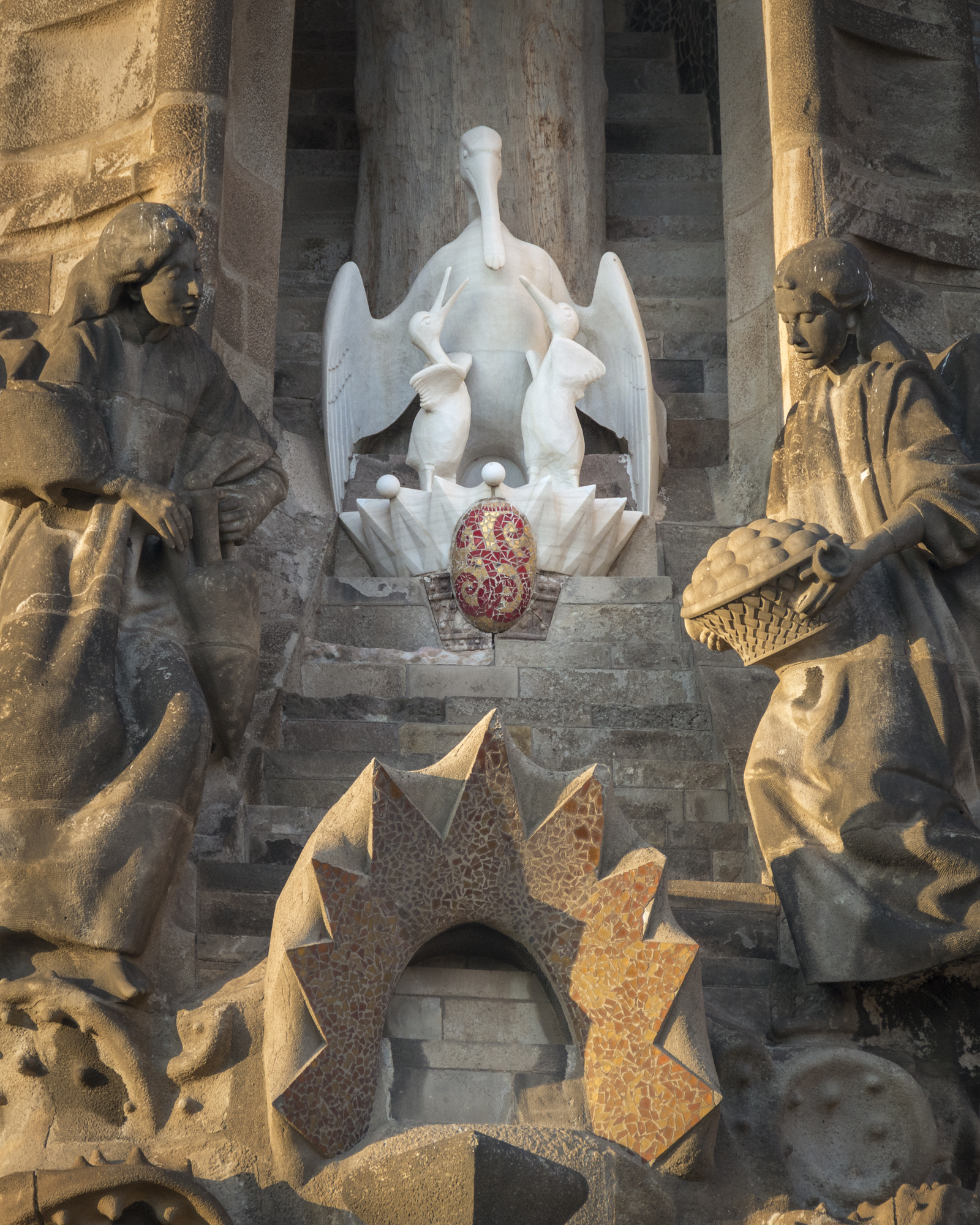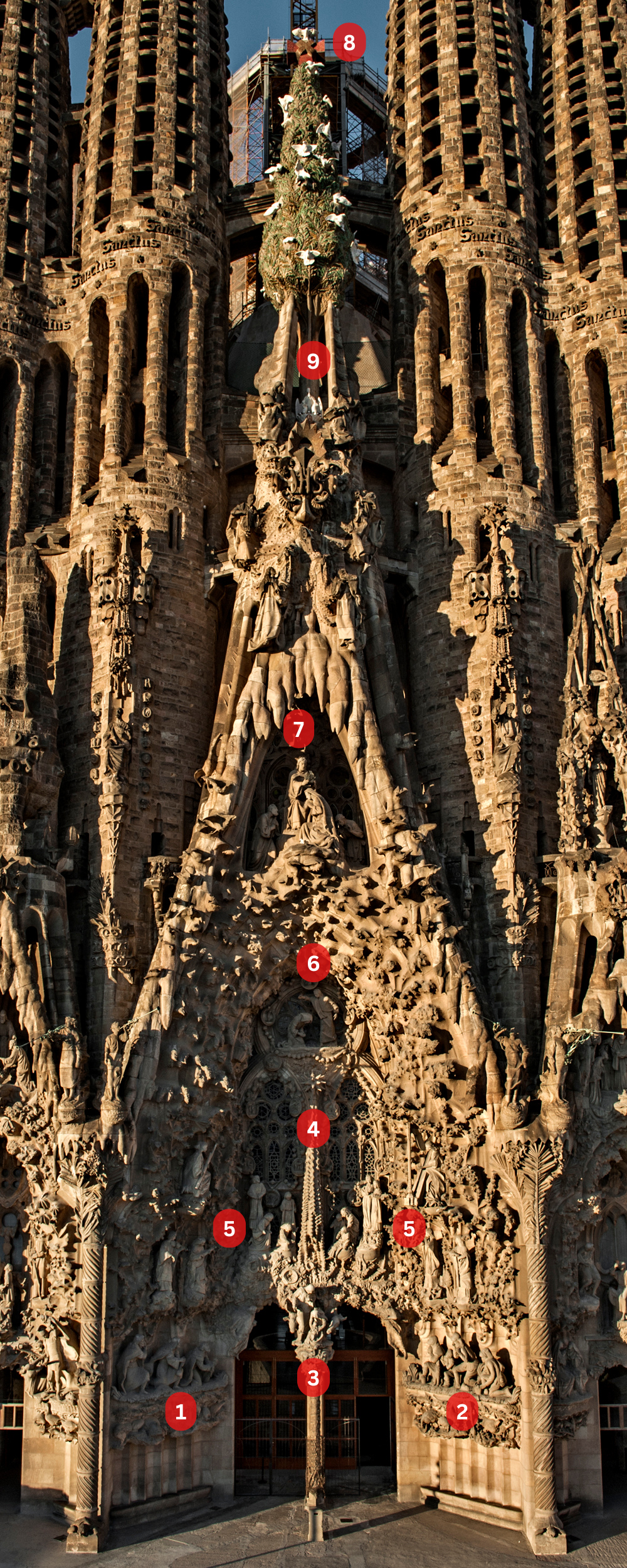 Antoni Gaudí volia que la façana del Naixement de la Sagrada Família fos un cant a la joia de la vida i a la creació divina. És per això que és plena d’animals (gallines, ànecs, insectes, amfibis, ocells diversos…) i elements vegetals (roses, lliris, falgueres, arbres fruiters, palmeres…) que lloen el naixement del Messies i reforcen el significat simbòlic de les escenes que s’hi representen. L’arquitecte associa la vinguda al món de Jesús amb l’esplendor de la natura i l’inici del dia, motiu pel qual situa la façana a llevant (a l’est), per on surt el sol, que a primera hora del matí il·lumina les escultures del conjunt. En aquest article veiem quines són.