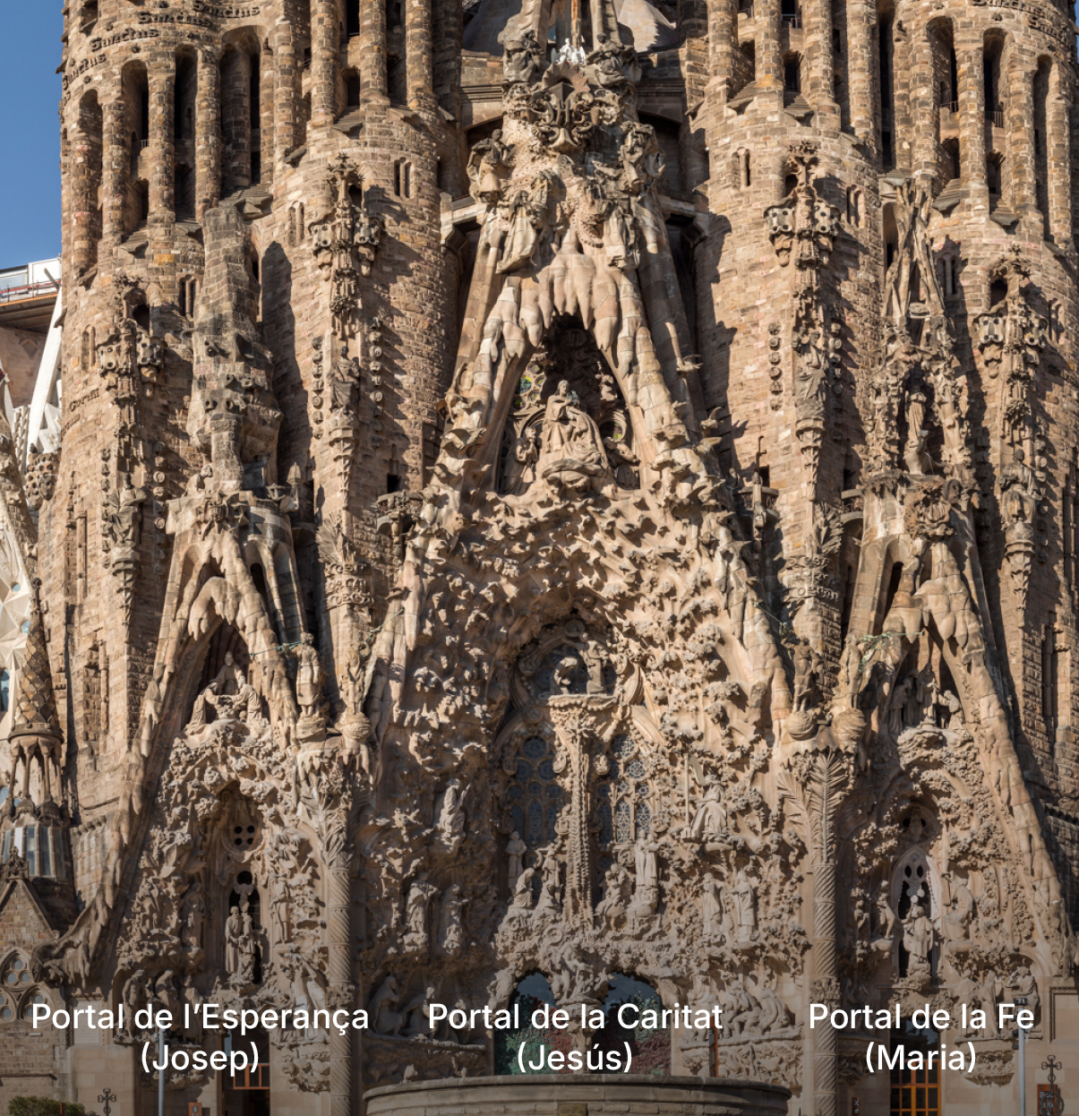 La façana, que es va començar a construir l’any 1891, es divideix en tres grans portals. D’esquerra a dreta, estan dedicats a les virtuts teologals de l’esperança, la caritat i la fe; i també a Josep, Jesús i Maria, amb els seus noms escrits en català a les tres columnes que els separen. Tot el conjunt està emmarcat per caramells de glaç.