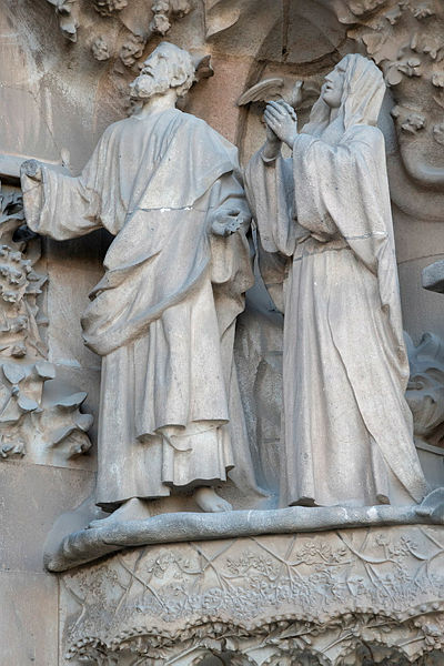 El grup escultòric de la part inferior esquerra del portal reprodueix la visita de Maria a Isabel, que estava embarassada, narrada a l’Evangeli.