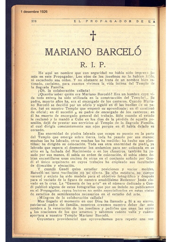 Recentment, però, s’ha localitzat l’obituari que El Propagador de la Devoción a San José, una publicació fundada pels promotors de la Sagrada Família, va dedicar a Mariano el desembre del 1926. En aquest text se’l relaciona explícitament amb la fotografia publicada a Gaseta de les Arts. L’escrit constitueix un homenatge a la seva aportació al temple: